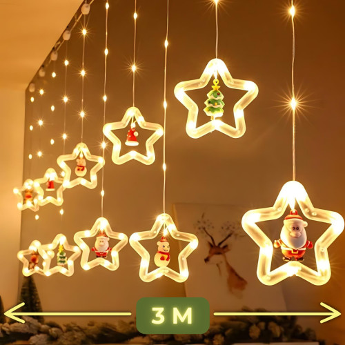 Світлодіодна гірлянда-штора "Зірки 3D з фігурками" - це чудовий вибір для створення незабутньої святкової атмосфери у вашому домі. Завдяки теплому білому світлу та фігуркам, що включають шапочки, ялинки, олені сніговики та діди морози, ця гірлянда надасть вашому інтер’єру справжній новорічний настрій.