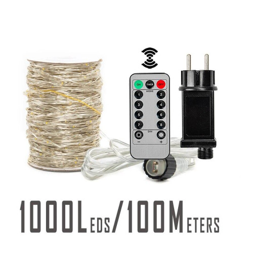 | Комплектация | ● Гирлянда роса 100 метров 1000 LED с питанием от сети 220В ● Пульт дистанционного управления ● Батарейка к пульту управления CR2025 |