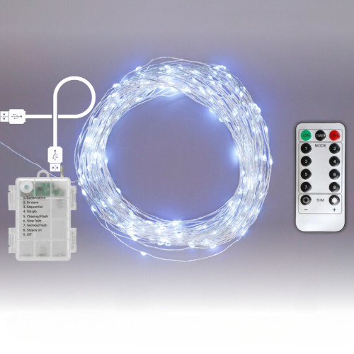 Гірлянда роса 20 метрів, 200 LED, 2в1 живлення від батарейок та USB, з пультом дистанційного керування 8 режимів