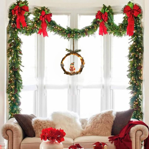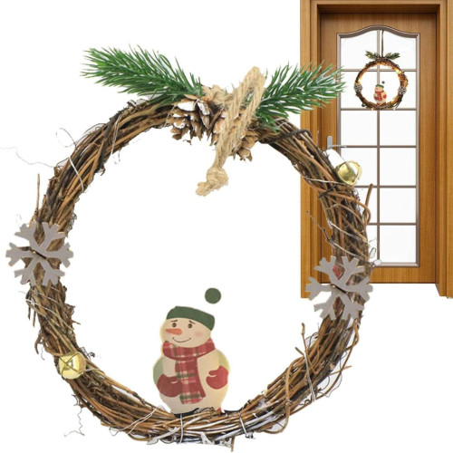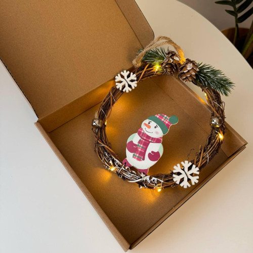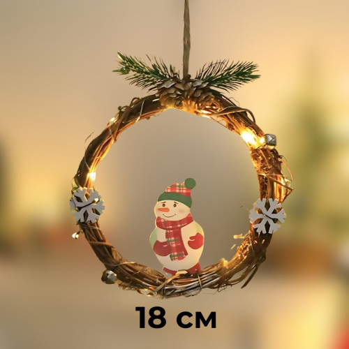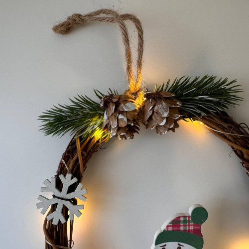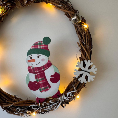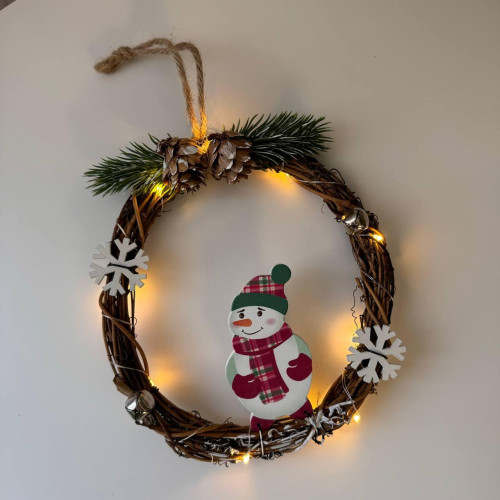Різдвяний вінок з ротанги новорічний віночок підвісний декор діаметр 18 см Niki Light LED від батарейок сніговик