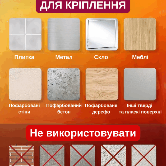 Гачки виготовлені з прозорого пластику, що робить їх майже непомітними на будь-якій поверхні. Завдяки сильній клейкій основі вони надійно тримаються на дереві, плитці, склі, меблях, пластику, пофарбованих стінах та шпалерах.