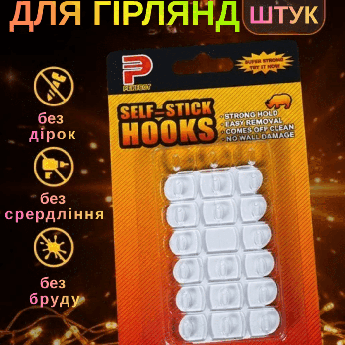 Самоклеючі гачки для гірлянд Perfect — зручне, швидке та акуратне кріплення для новорічних гірлянд та легкого декору без цвяхів і без інструментів.