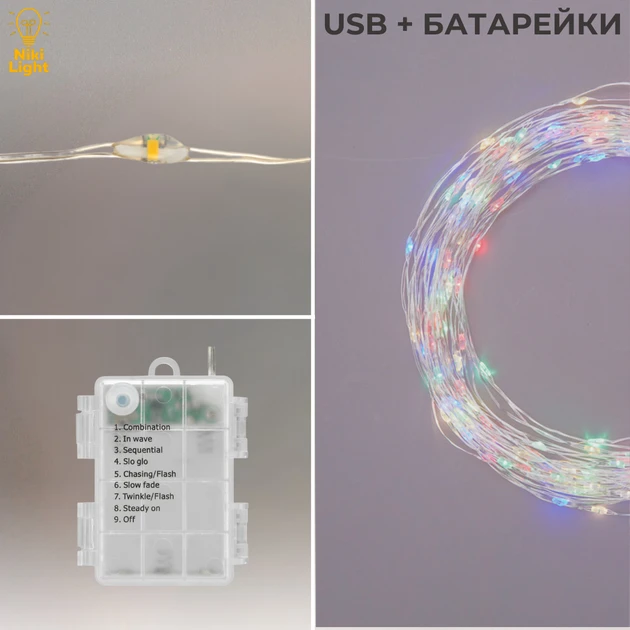 Гірлянда на батарейках роса Niki Light 30 метрів 300 лед пульт 8 режимів гірлянда від батерейок та USB 2в1 Кольорова