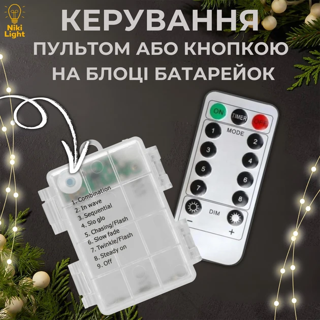 - Різноманітність режимів: пульт дистанційного управління дозволяє вибирати з кількох режимів освітлення, включаючи мерехтіння та статичний режим, також є можливість регулювати яскравість гірлянди.