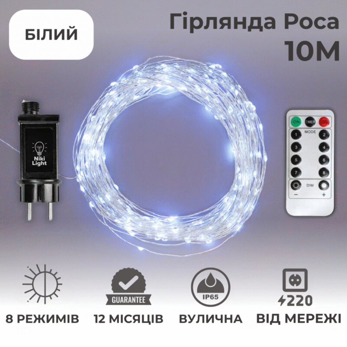 Гірлянда роса 10 метрів гірлянда капля роси з режимами 100 лед гірлянда на пульті вулична гірлянда 220в біла
