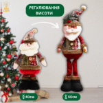 - Регульовані телескопічні ніжки: Легко налаштовуйте висоту Діда Мороза від 40 см до 50 см завдяки телескопічним ніжкам. Це дозволяє вам легко адаптувати фігурку до різних місць вашого дому – на полиці, біля каміна або на підлозі. Зміна висоти забезпечує ідеальне розташування Діда Мороза для будь-якого святкового декору.