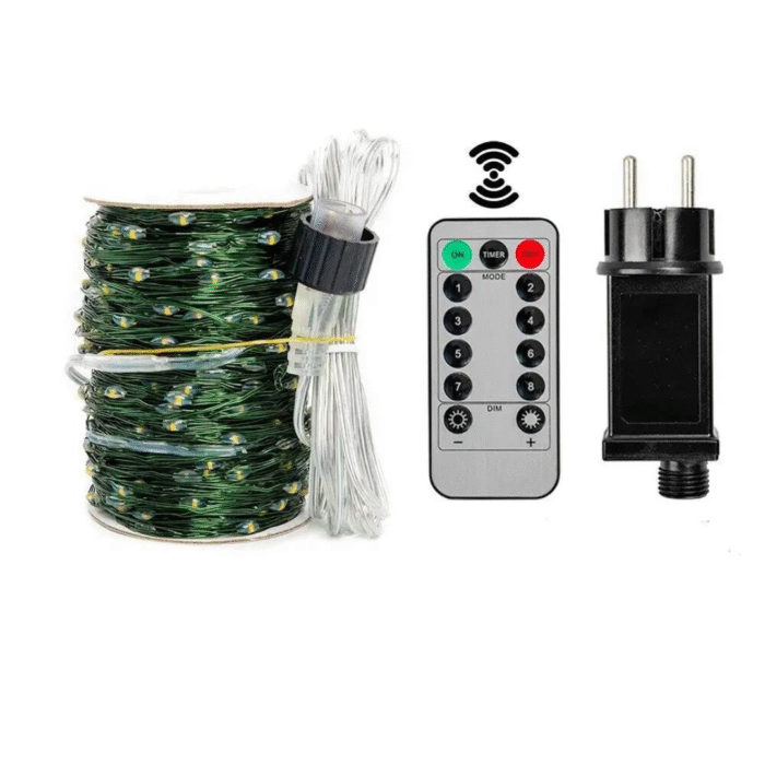 | Комплектація | ● Гірлянда крапля роси 100 метрів 1000 LED з живленням від мережі 220В, зелений провід ● Пульт дистанційного керування ● Батарейка до пульта керування CR2025 |