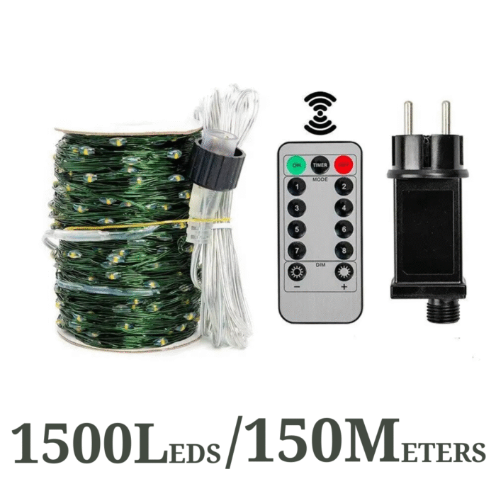 | Комплектація | ● Гірлянда крапля роси 150 метрів, 1500 LED з живленням від мережі 220В ● Пульт дистанційного керування ● Батарейка до пульта керування CR2025 |