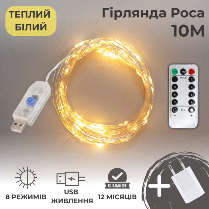 Гірлянда роса 10 метрів, капля роси з режимами, 100 LED, гірлянда на пульті, гірлянда від USB, тепла біла