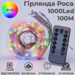 | Комплектація | ● Гірлянда роса 100 метрів 1000 LED з живленням від мережі 220В ● Пульт дистанційного керування ● Батарейка до пульта керування CR2025 |