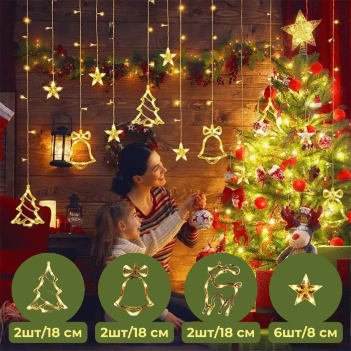 Світлодіодна гірлянда-штора “Led Завіса Мікс” – це чудовий вибір для створення незабутньої святкової атмосфери у вашому домі. Завдяки теплому білому світлу та фігуркам, що включають дзвіночки, ялинки, олені та зірочки, ця гірлянда надасть вашому інтер’єру справжній новорічний настрій.